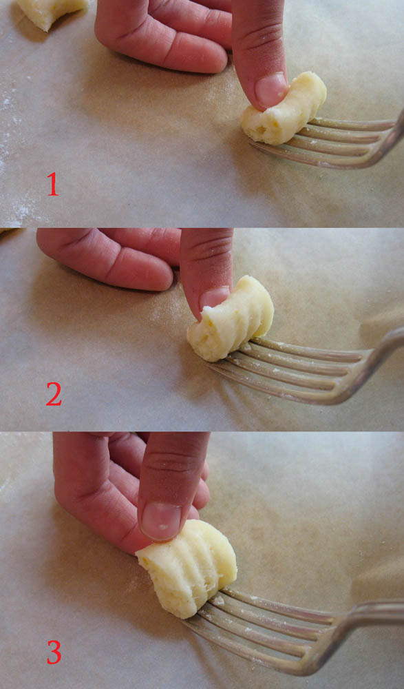 Slice the ropes into 1 inch-long pieces. Sprinkle the rounds lightly with flour and roll each piece quickly between your palms into a rough ball, flouring the dough and your hands as needed to prevent sticking. Hold the tines of a fork at a 45-degree angle to the table with the concave part facing up. Dip the tip of your thumb in flour. Take one ball of dough and with the tip of your thumb, press the dough lightly against the tines of the fork as you roll it downward toward the tips of the tines. As the dough wraps around the tip of your thumb, it will form into a dumpling with a deep indentation on one side and a ridged surface on the other.
